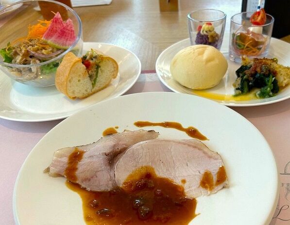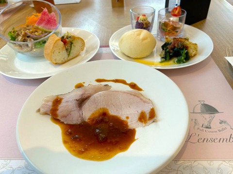 ランチ時間でお客様が次々と来られますので、テーブル席の一部を撮影させていただきました。明るく広いアンサンブルは、テーブル配置がゆったりとしているので、お客様がいらっしゃっても静かでゆっくりと楽しむことができます。宝塚歌劇の曲がBGMで流れるのも優雅な気持ちになります♪