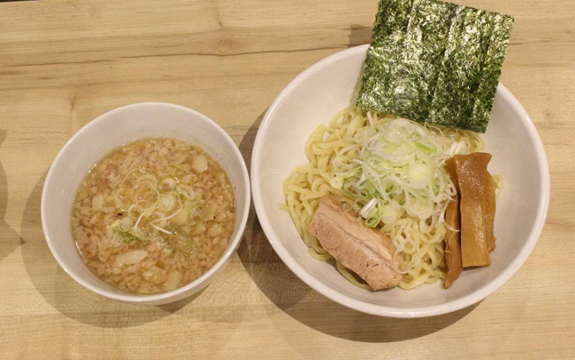 つけ麺のスープは、ラーメン用の背油豚骨スープをベースに。かえしの醤油と味噌、そして砂糖や酢を加えて少し酸っぱいテイストに仕上げたそう。麺は、千葉県の製麺所で作った麺を使用。
