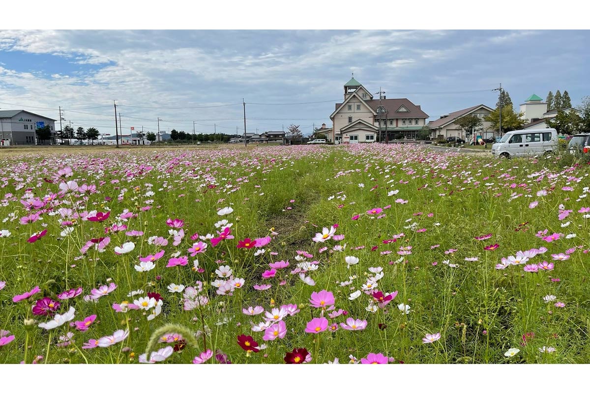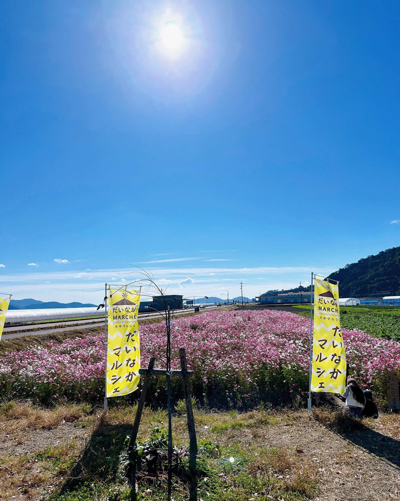 「大中グリーン工房」では、春は菜の花、夏はひまわり、秋はコスモスと季節ごとのお花畑を楽しむことができます。これからの季節は可愛らしい花を咲かせるコスモス畑に。ピンク、薄ピンク、白のコスモスが咲く畑の中を歩いて楽しめます。直売所が休みの月曜日〜土曜日も、お花畑は楽しむことができます。