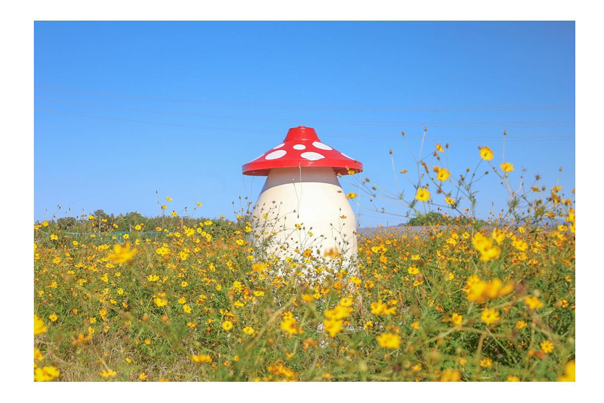 一面黄色とオレンジのコスモスが咲き乱れるキバナコスモス側には、Instagramでも人気の可愛いキノコのオブジェがあり、撮影スポットとして人気です。咲き乱れるコスモスの中を歩ける遊歩道もあり、コスモスに囲まれた素敵な写真が撮れるかも♪