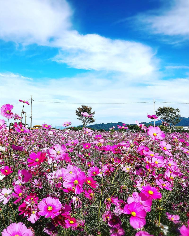 コスモスは近江八幡市の秋の花として指定を受けており、10月の見頃になると広大な敷地にピンクと白の鮮やかなコスモスが咲き乱れます。口コミやSNSなどで有名になり、例年多くの人が訪れる観光スポットとなっているそうです。残念ながら2024年は諸般の事情により中止されているため、2025年の開催状況については公式サイトや公式Instagramをご確認ください。