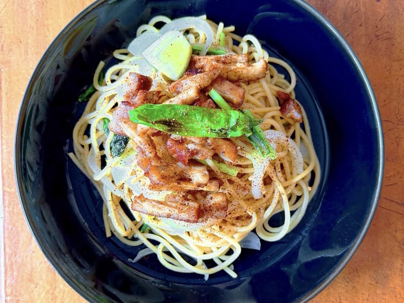 メキシコの伝統肉料理「カルニタス」を取り入れたスパゲッティーです。エキゾチックな風味で、仕上げにライムを搾ると爽やかな風味が引き立ちます。