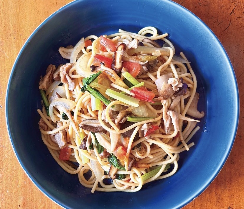 キノコの旨みとフレッシュトマトの爽やかな風味が広がる、和風醤油ベースのスパゲッティです。