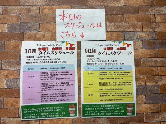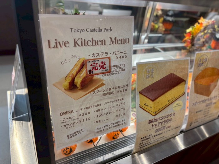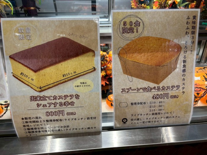 日によって異なるがや「出来立てカステラをシェアする幸せ(800円)」や「スプーンで食べるカステラ(480円)」など。