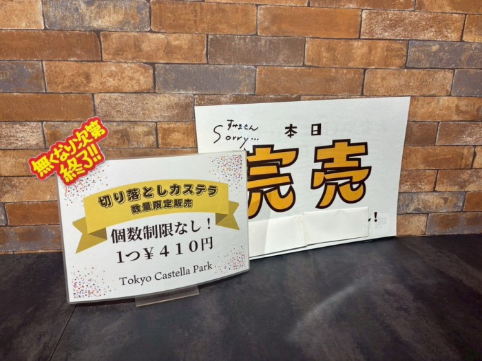 気を取り直して、1階に戻ると、定番のカステラはもちろん、人気の「切り落とし」や「限定商品」の文字がズラリ。