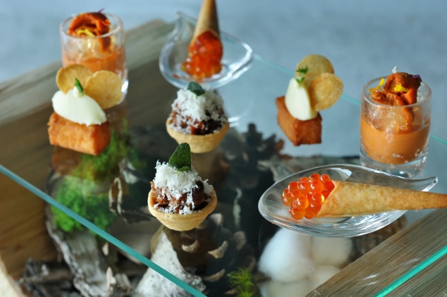 コースの始まりを彩る小前菜は、海と大地からの恵みを凝縮した華やかな4種類の料理。コルノは、爽やかなレモンや香草の香りを合わせたサーモンのパテを詰め、イクラがふんだんに盛りつけられています。