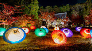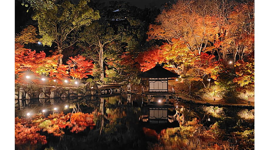 秋の夜間、色づいたもみじと寺院建築が照らし出され、幽玄で静かな雰囲気が広がる特別な催しです。
