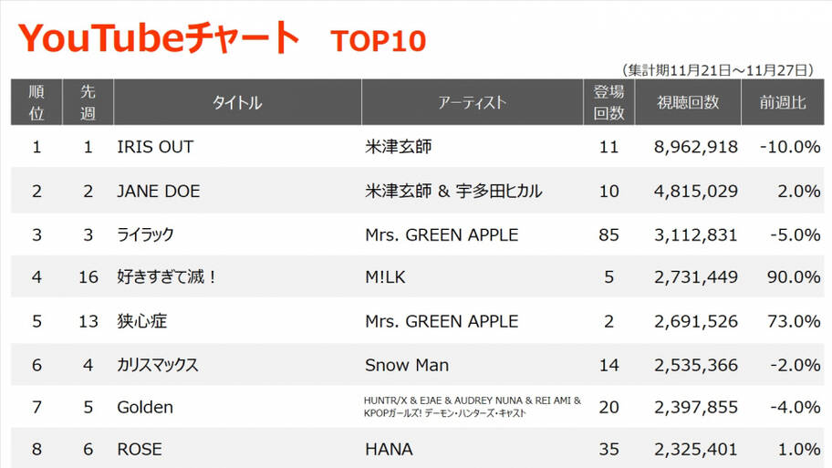 劇場版『チェンソーマン レゼ篇』の主題歌として書き下ろされた、米津玄師「IRIS OUT」が前月12位から順位を上げ、2位にランクイン。本編映像が使用されたMVは物語と深くリンクしたフルアニメーション映像となっており、11月27日8時27分にYouTube1億回再生を突破!9月15日に公開されてから73日という、自身最速での1億回再生突破となりました。