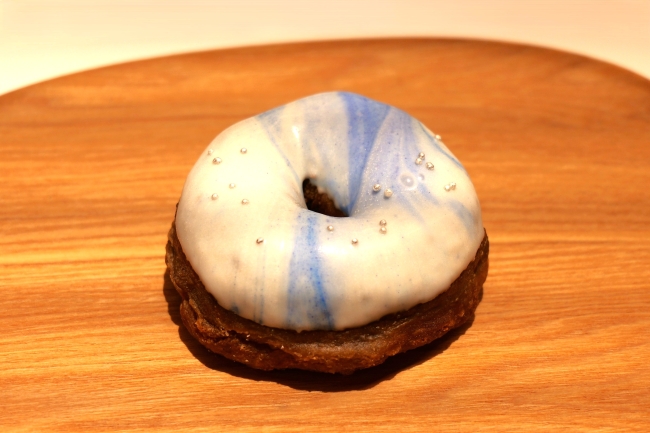 鮮やかなビジュアルが目を引く『スペイシーブルー』(367円)は、ほうじ茶生地に宇宙をイメージしたマーブル模様のチョコレートがコーティングされています。モチっとした生地と、パリッとしたチョコレートの食感の相性が抜群です。