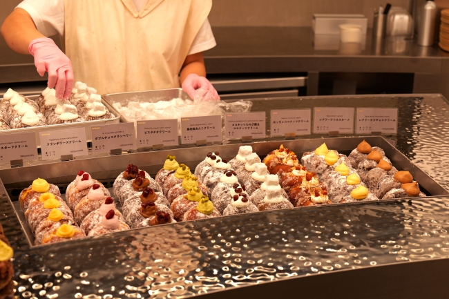 生ドーナッツの賞味期限は当日中。そのため、毎朝店内奥の厨房で生地を1から手作りしているのだそう! すべての生地と生クリームには、ミルク感の濃い北海道産の牛乳が使われています。特に生クリームは商品に合わせて固さを変えてフレーバーを付け、ドーナッツに1つずつ注入して仕上げています。