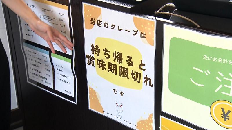 店内に入ると、幸せを感じる甘い香りが漂っています。まず目に飛び込んでくるのが「当店のクレープは持ち帰ると賞味期限切れです」と書かれたポスター。