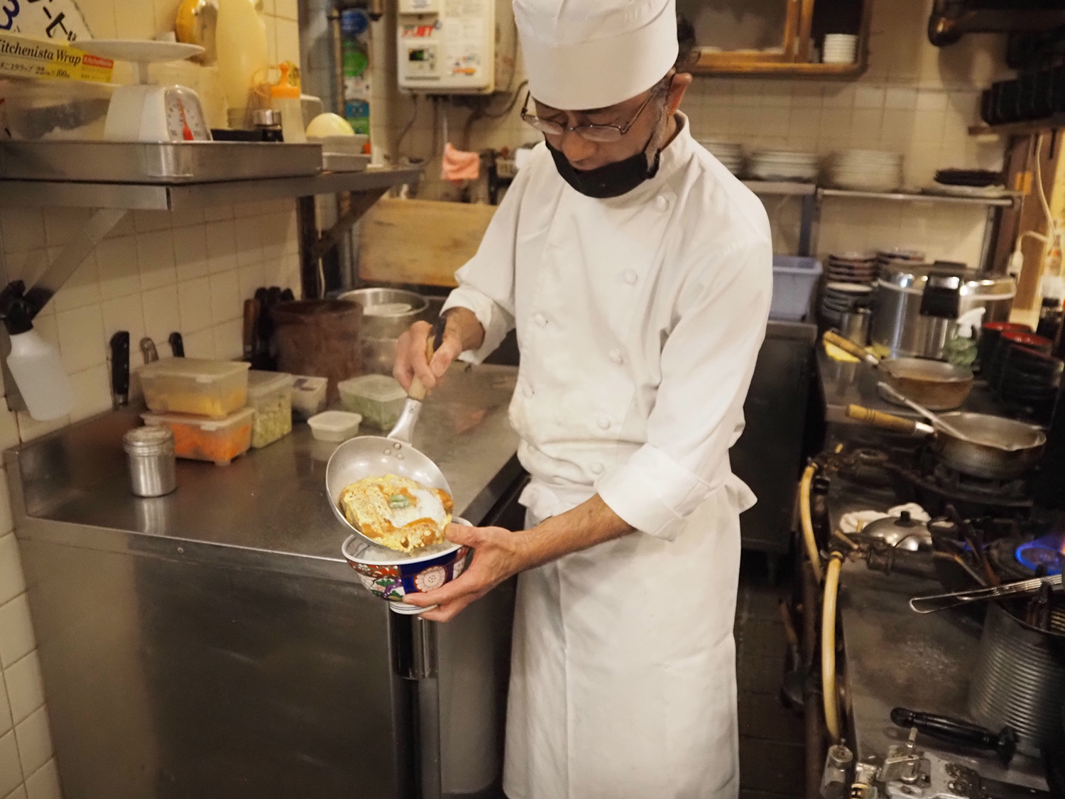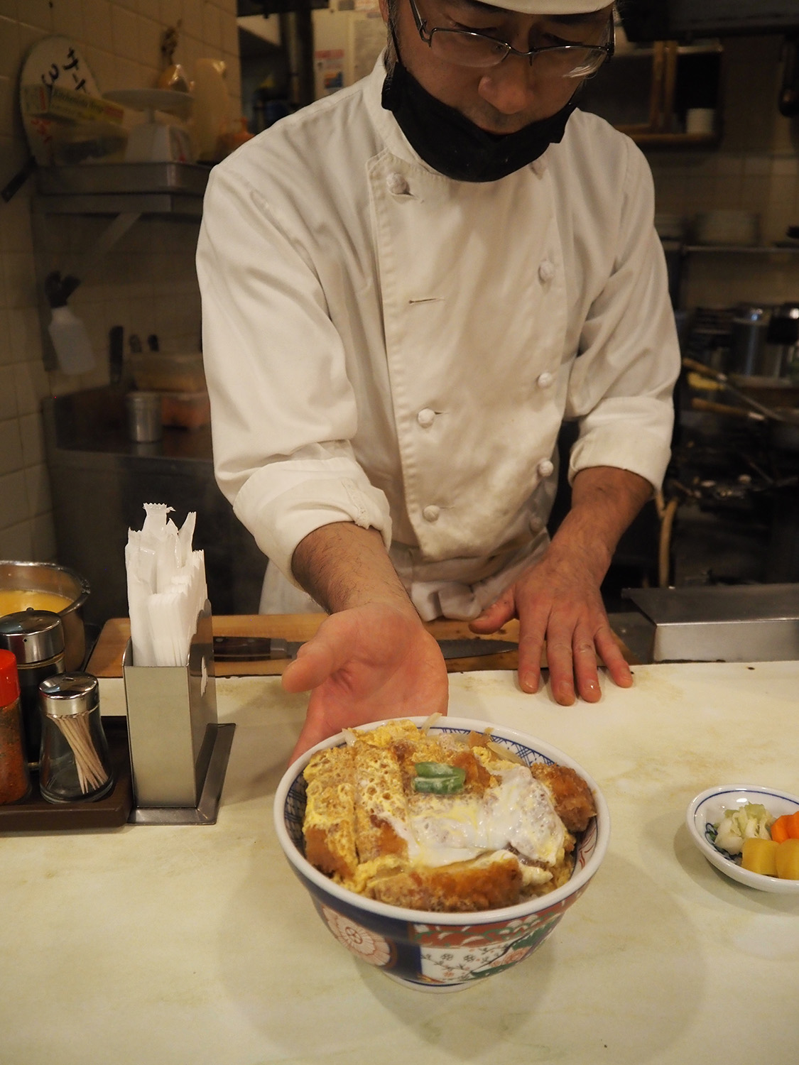 店は「東京交通会館」の地下にある。先代以来の安心の業者さんから仕入れる良質の国産豚肉は、筋をしっかりと切って下処理され、あらびきの生パン粉をまとわせてから、中村さんの手によって手早く高温のラードのなかに投じられる。しばらくして、絶妙のタイミングで肉をひきあげると、ただちに小鍋に移し、たれと卵でとじ、釜炊きの国産米をたんと盛った丼の上にすべりのせて完成。