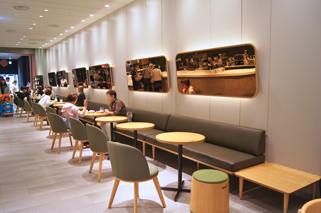 他の店舗ではあまり見かけないミラーウォールは落ち着いた色合いで、店舗のアクセントになっています。どこか昔ながらの喫茶店のよう雰囲気のある店内は、ショッピング中の休憩はもちろん、コーヒー片手におしゃべりを楽しめる空間になっています。
