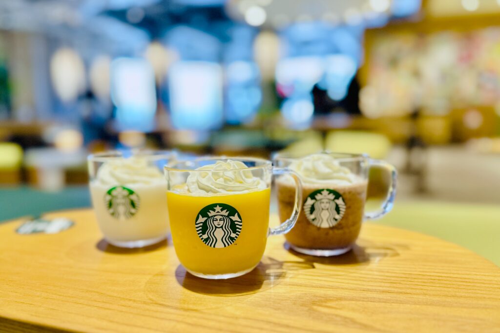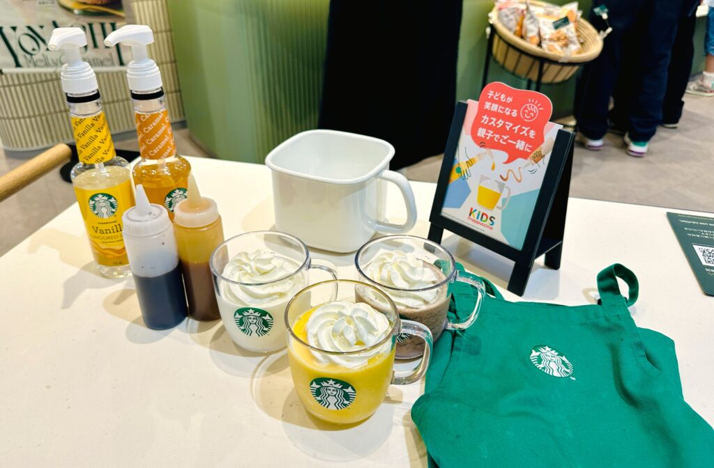 ファミリーフレンドリーストアでは「子どもも大人も楽しい」をコンセプトに、通常メニューに加え、12歳以下の子ども専用の「キッズ フラペチーノ®」を展開。バニラ、マンゴー&フルーツ、チョコレートの3種類から選べます。通常のフラペチーノよりも甘さがあり、クリーミーな仕上がりで子どもにも飲みやすい工夫がされています。取っ手付きの樹脂製グラスで提供されるフラペチーノは、バーカウンターでカスタマイズも可能!小さいスタバエプロンを付けて、モカやキャラメルなど好みのシロップやソースをかけて楽しむことができます。