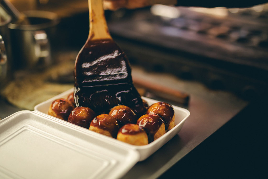 アツアツのたこ焼きに、たっぷりとソースを絡める。