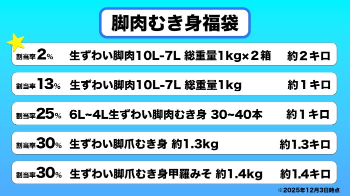 とはいえ、売っている全ての福袋が全て満足いくものなのかどうかはまだ断定ができない。前回は「タラバかに福袋」、前々回は「生かに福袋」を開封したので、今年は新しく登場した『脚肉むき身福袋』を試してみようと思う。事前に公表されている中身と当選割合は以下の通りだ。