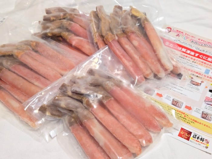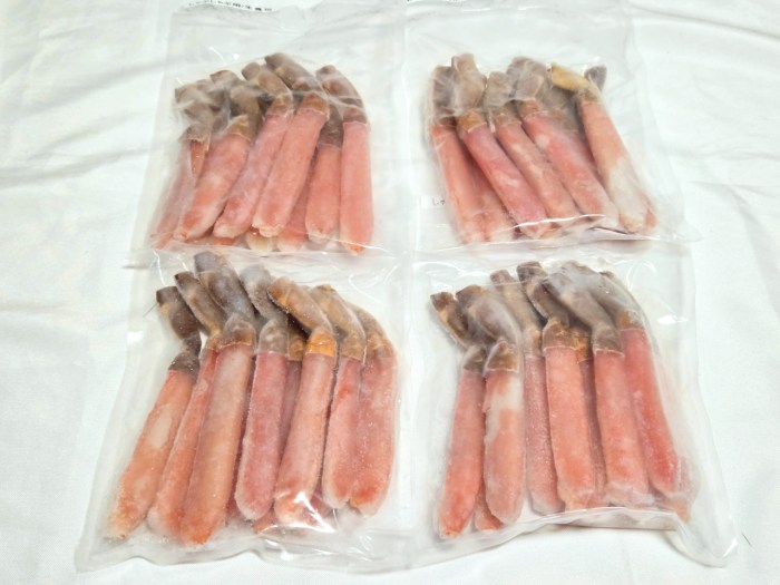 これは正真正銘「脚肉むき身福袋」の大当たり枠「生ずわい脚肉10L-7L 総重量2キロ」だ。綺麗に剥かれたずわいガニの脚が1袋に10本ずつ、合計2キロ入っている。これだけ立派な生食用の脚なんて、そこらへんのスーパーやデパートなんかじゃなかなか売ってないよね。