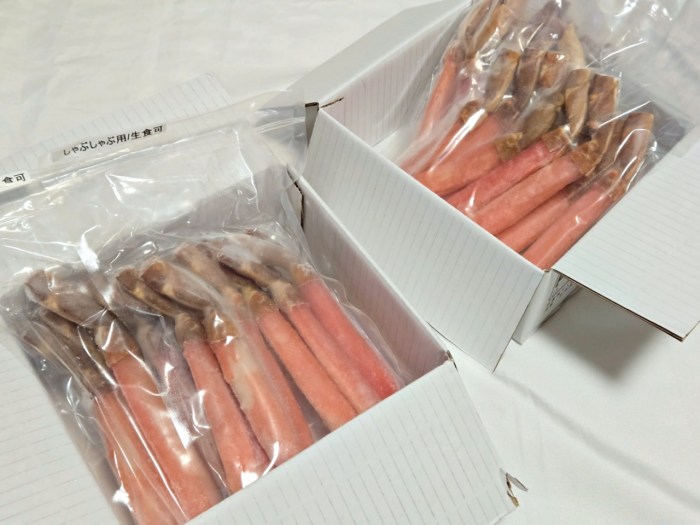 まあどれがきても、刺身で食べられるくらい鮮度の良い生ズワイが必ず届くというのは「脚肉むき身福袋」の魅力ではあるのだけどね。そんなこんなでそこまで期待もせず待つこと数日、我が家に届いた福袋はというと……