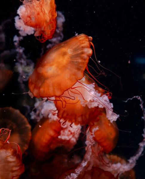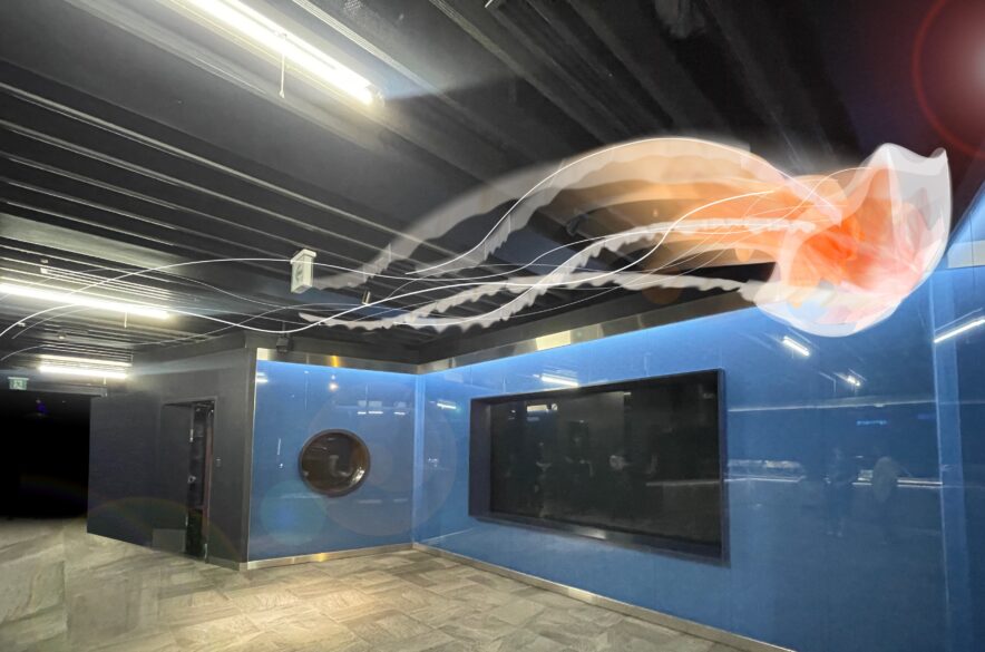 2階「ミテッテ」エリアでは、クラゲの生態や飼育員の業務風景など、スタッフが撮影した計12点の写真を大型ポスターで特別展示。クラゲの写真に囲まれたギャラリーのような空間を楽しむことができるそうです。