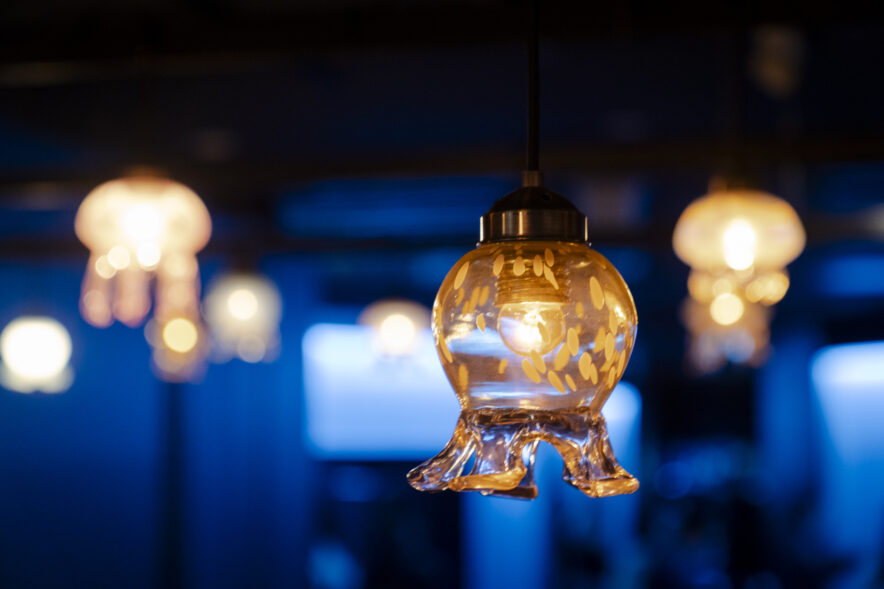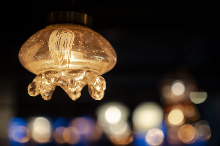 「クラゲワンダー」ゾーンでは、京都水族館で飼育されている約20種類のクラゲをモデルにしたガラスランプを展示。新潟県のガラス工房「TAKU GLASS」による手作りで、飼育スタッフが監修のもと、一つひとつ丁寧に制作されています。