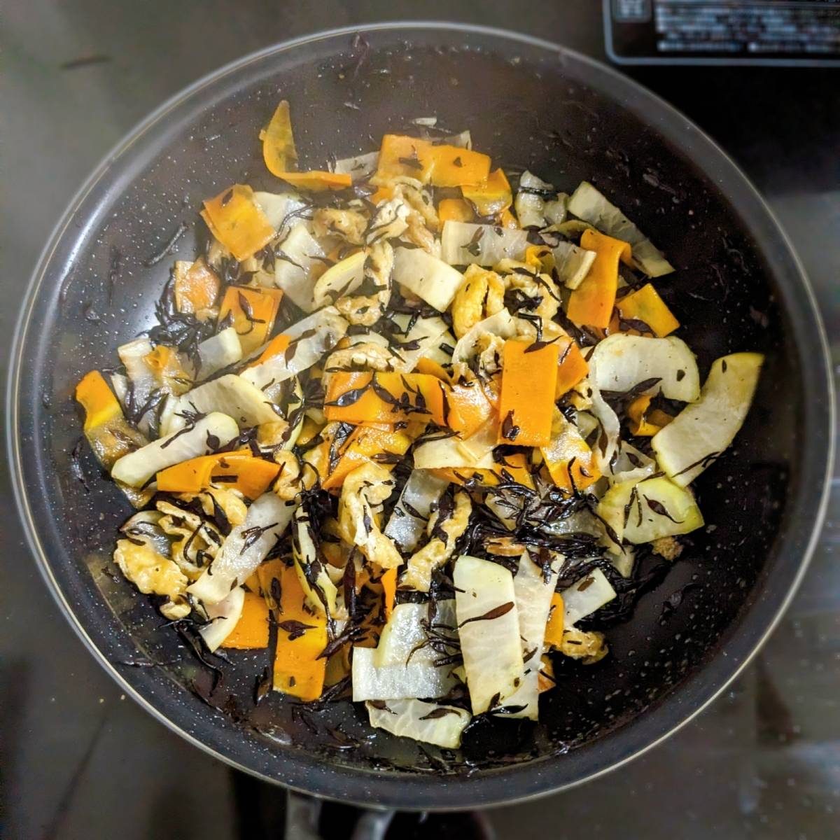 にんじんも加えて火が通ったら、油揚げとひじきを加えて炒めます。