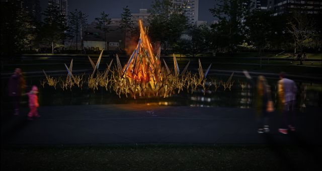 「うめきた公園」では訪れる人が暖かさを感じられるよう、水盤に篝火(かがりび)を模した高さ4m、幅15mのシグネチャーモニュメントを設置。ミストと音楽の演出を重ねることで、篝火のようにゆらめく光を表現します。