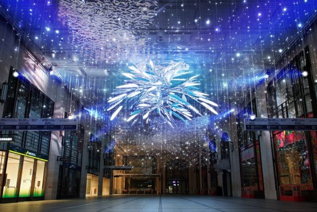 11月21日(金)~12月25日(木)の期間、「大阪梅田ツインタワーズ・ノース」1階「コンコース」のクリスマスイルミネーション「Cosmic Feather ~祈りの翼~」との初コラボレーションも展開。約7,000もの羽根と大きな翼が、ひとつのラインを描くように繋がり合うイルミネーションは圧巻。光と音の演出がコンコース全体を包み込む、幻想空間を体感できます。