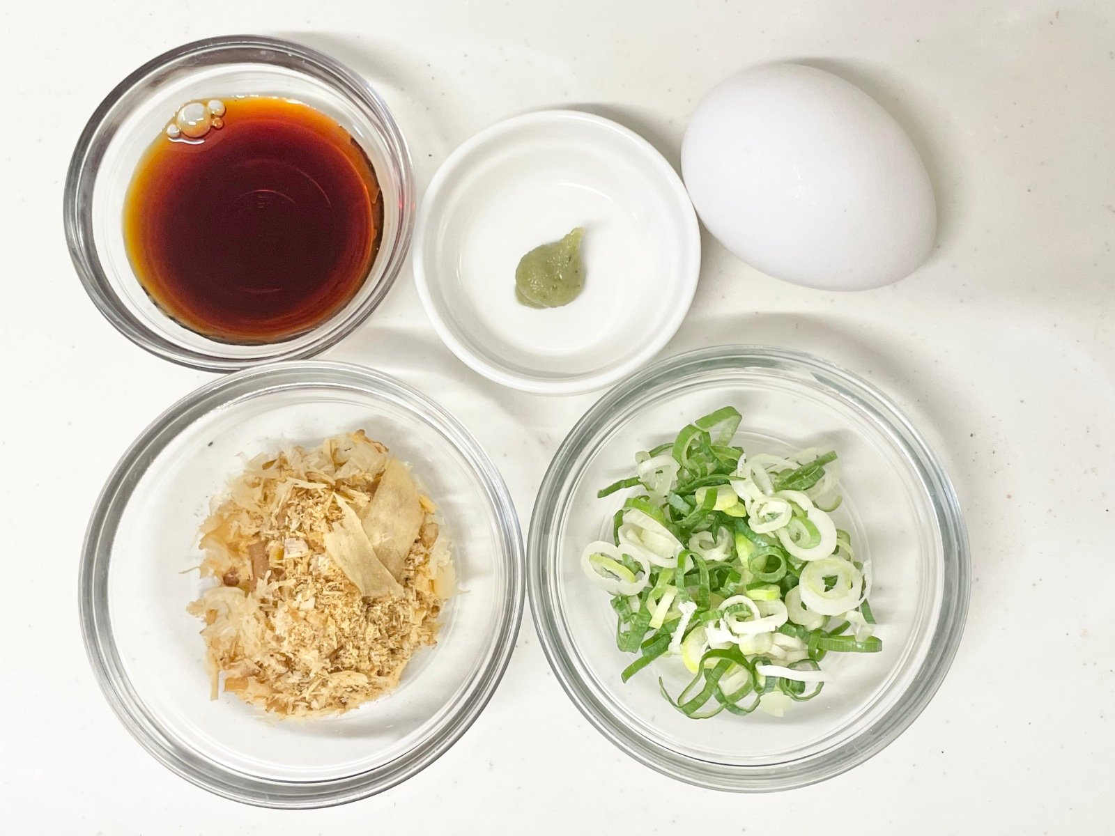 TKGにかつお節と青ねぎをのせたら、わさびじょうゆをかけるだけ。