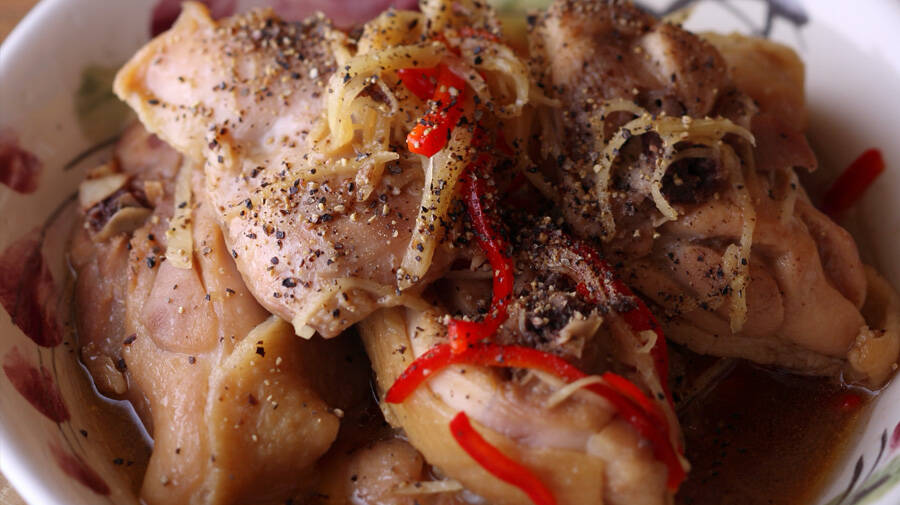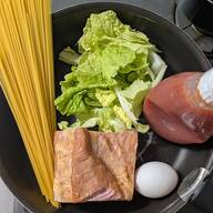ここに、パスタのゆで汁をお玉1/2杯加えてください。