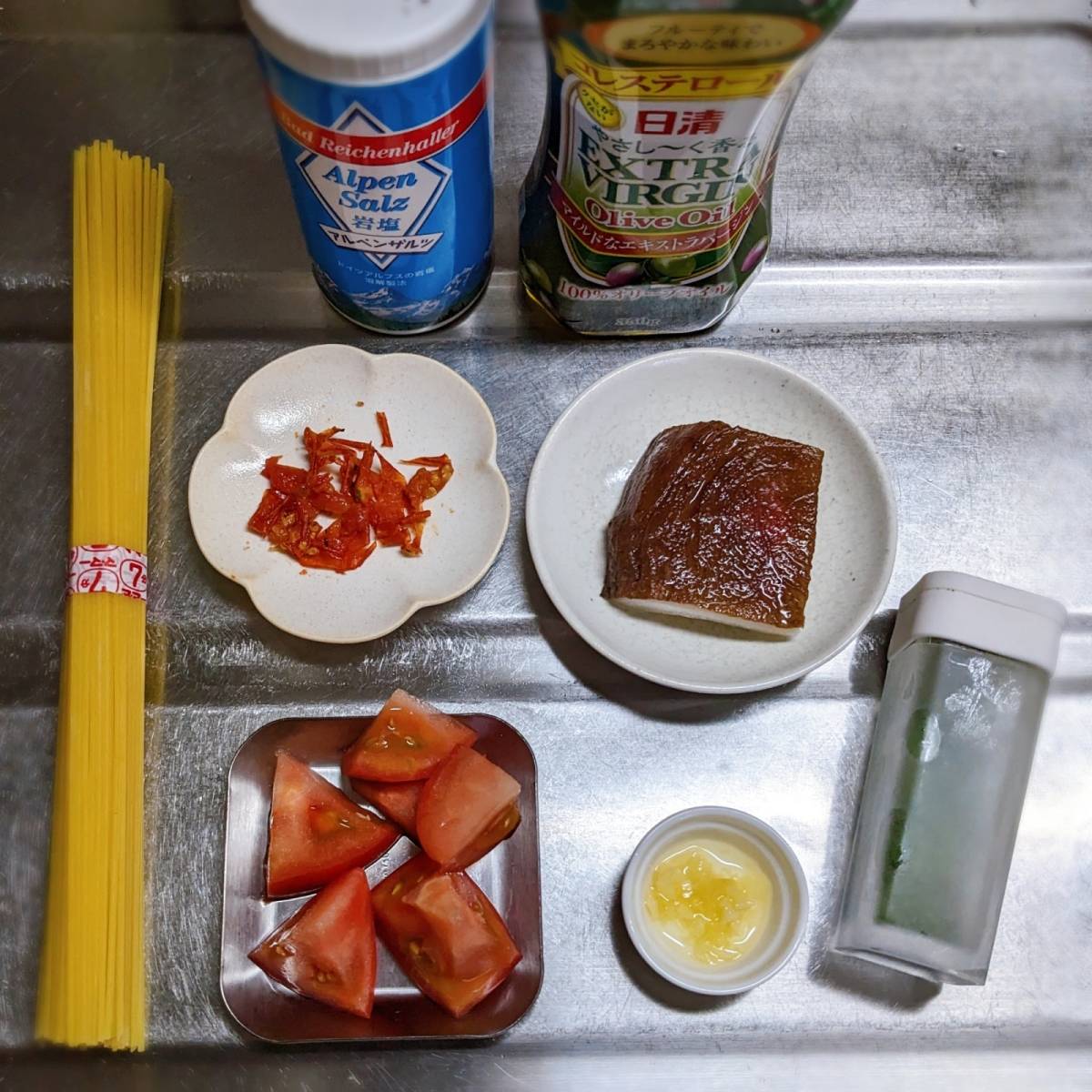 1人前で「たことドライトマトのスパゲティ」を作ってみましたよ♪