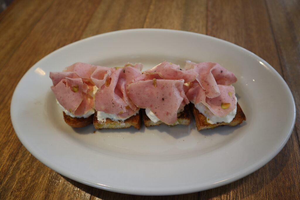 それをカリカリに焼いて、クリーミーなストラッチャテッラを乗せ、その上に自家製のモルタデッラ(ボローニャハム)を乗せる。