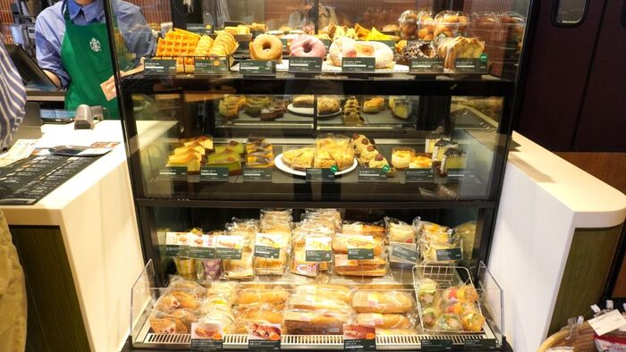レジ横にはお馴染みの軽食やケーキが並んでいます↓