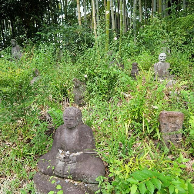 小さな竹藪の前に夏草が生い茂り、その中から様々な石仏を顔を覗かせるのですな。白い花がちらほらと咲いていて・・・
