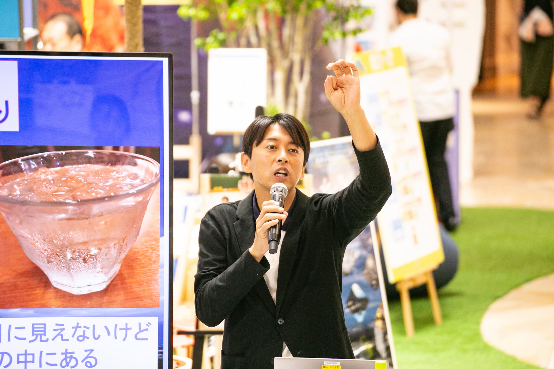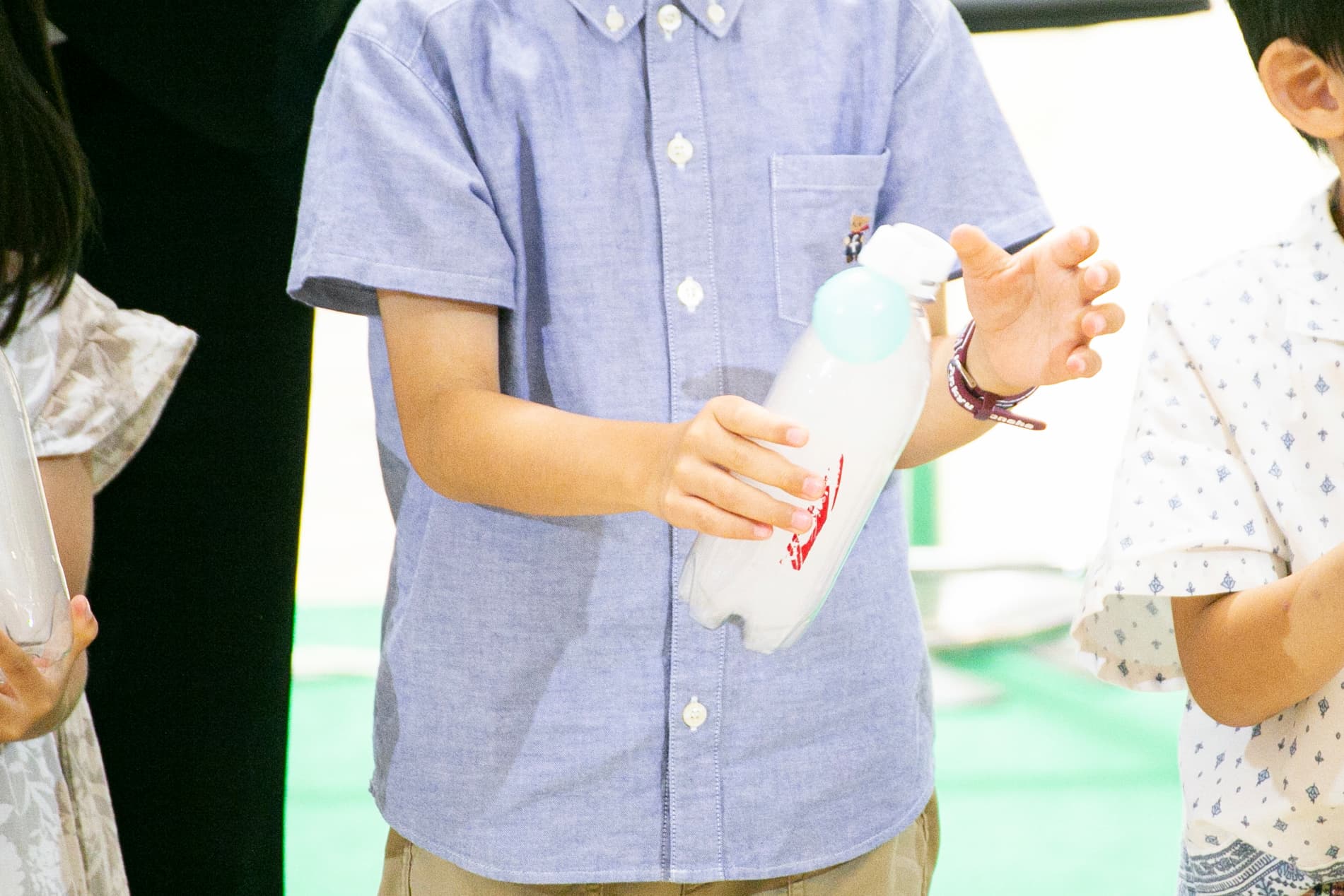ステージに登壇した蓬莱さんは、まず「雲は水蒸気でできていて、目には見えないけれど空気の中にあるんです」と、雲のしくみをわかりやすく解説。そして「実際に、この場所で雲をつくってみましょう!」と呼びかけ、子どもたちと一緒に実験スタート!