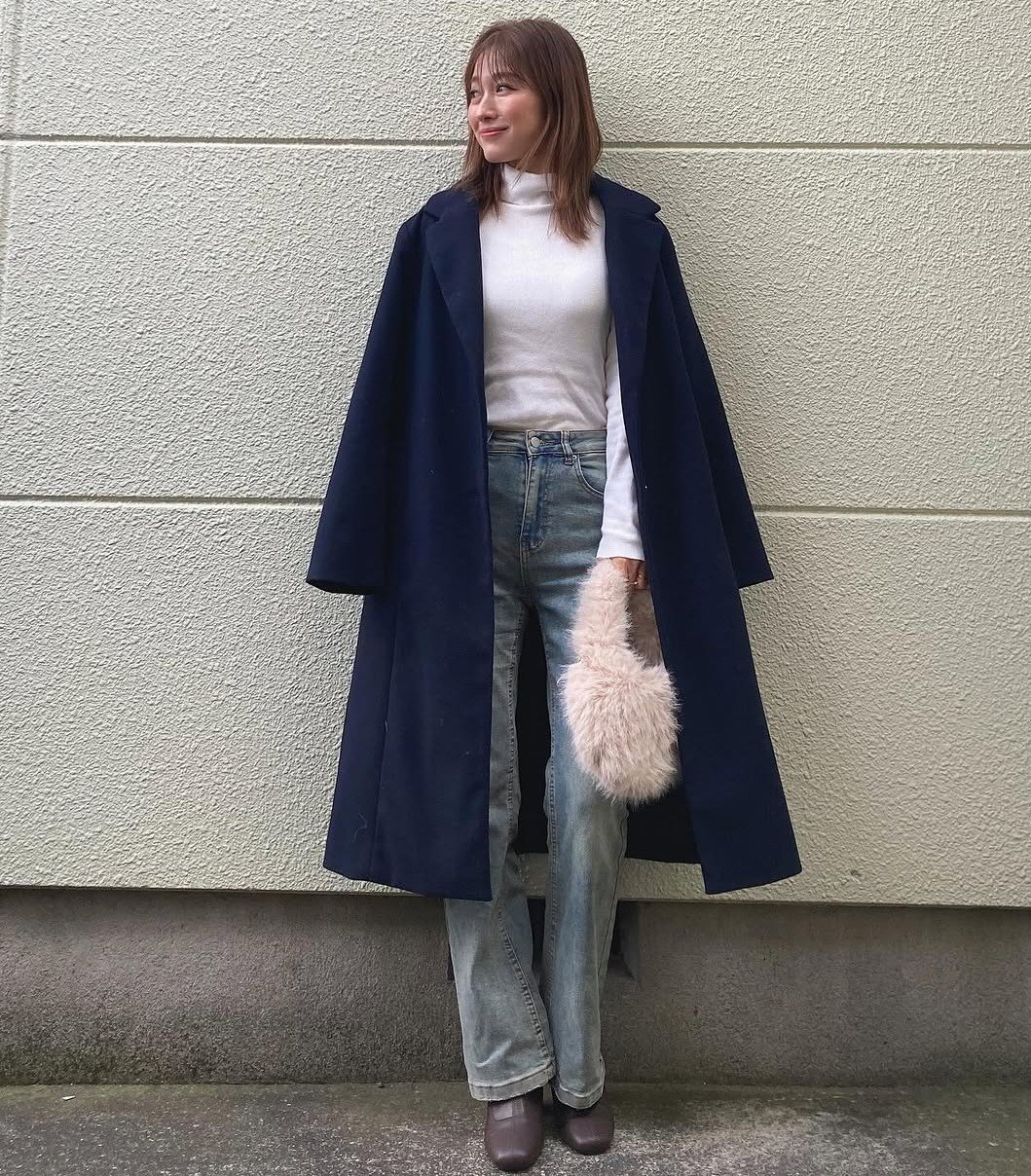 白のタートルネック×デニムのベーシックな組み合わせに、オーバーサイズのチェスターコートをプラス。