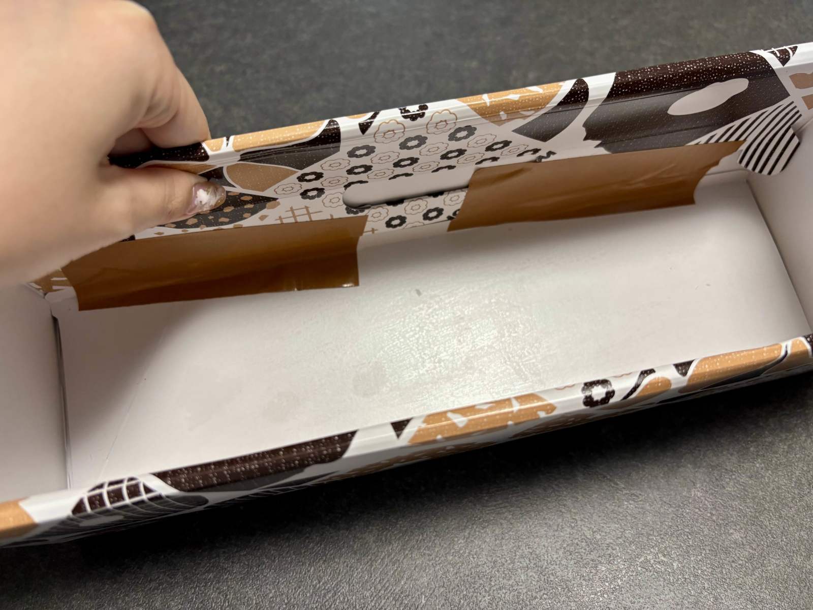 次に箱の持ち手部分を内側に折り込み、テープで固定します。
