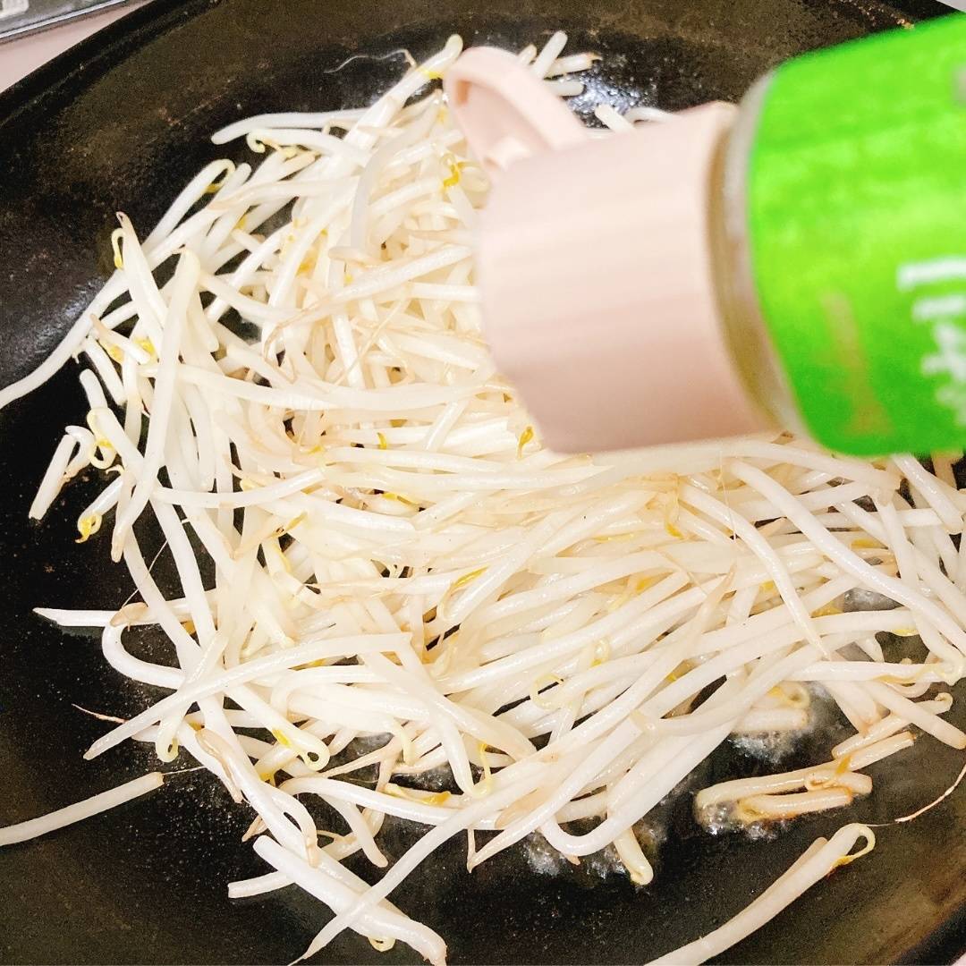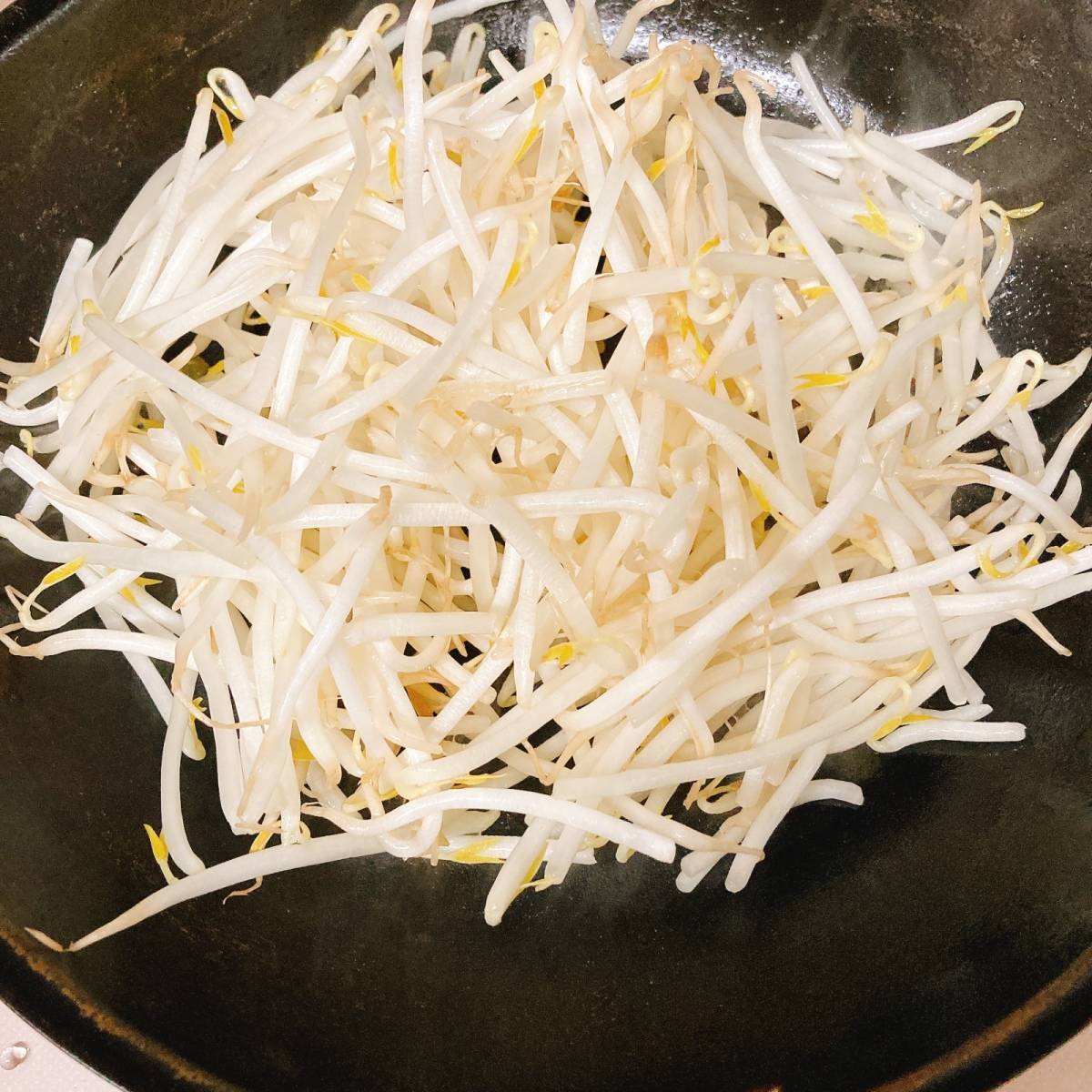 フライパンにサラダ油を引いて、もやしを炒めます。