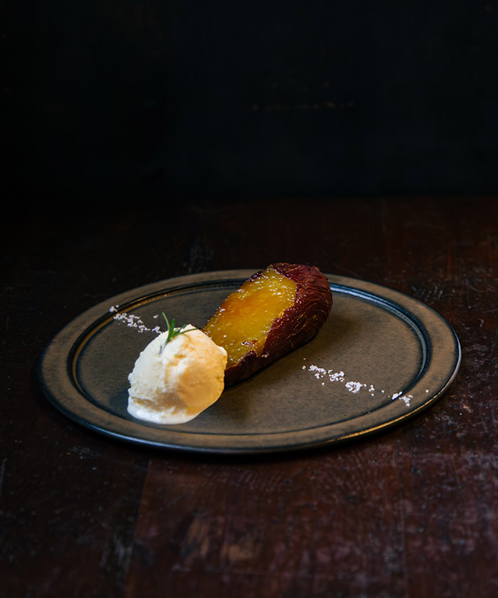 難波さん:お肉を使って何かをつくろうと思うと、その日に売り切らなきゃいけなくて。焼き芋だったらまとめて焼いて、冷凍で保存できるなと思ったんです。冷凍しても美味しく食べられるところもいいなと思って。お肉屋さんのときは、焼き芋をブリュレにしたものをカップに入れて、バニラアイスを添えて出していました。
