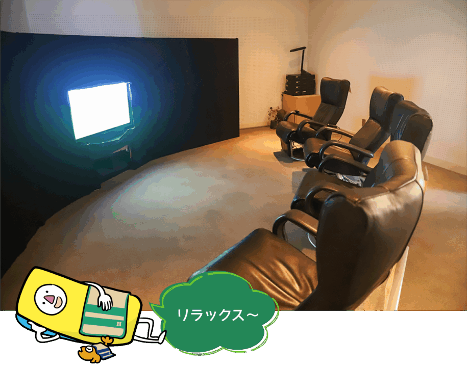 4席のリラックスチェアが並び、部屋は落ち着いた暗さに包まれています。自然を感じる映像を眺めながら、心ゆくまでリラックスできる空間。哲学の世界に触れたあと、ちょっと一息つきたいときにぴったりです。