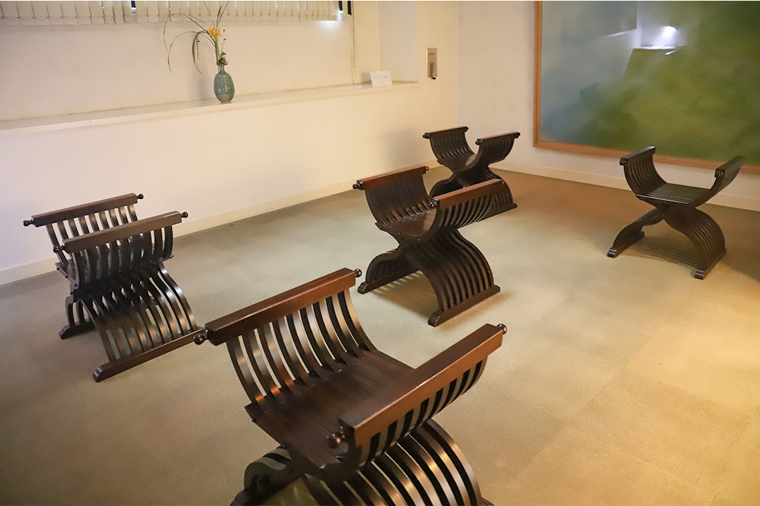 続いては瞑想室へ。ここは瞑想専用の空間で、独特な形をした椅子がずらりと並んでいます。