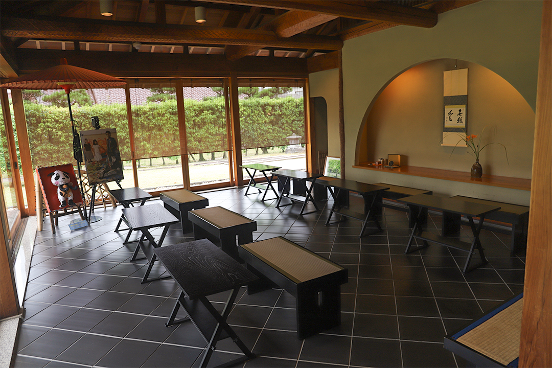 入るとすぐにテーブルと椅子を使う立礼式の茶席があります。伝統的な趣ながらも、正座をすることなくリラックスした雰囲気でゆったりとお茶菓子とお茶を楽しめる空間です。