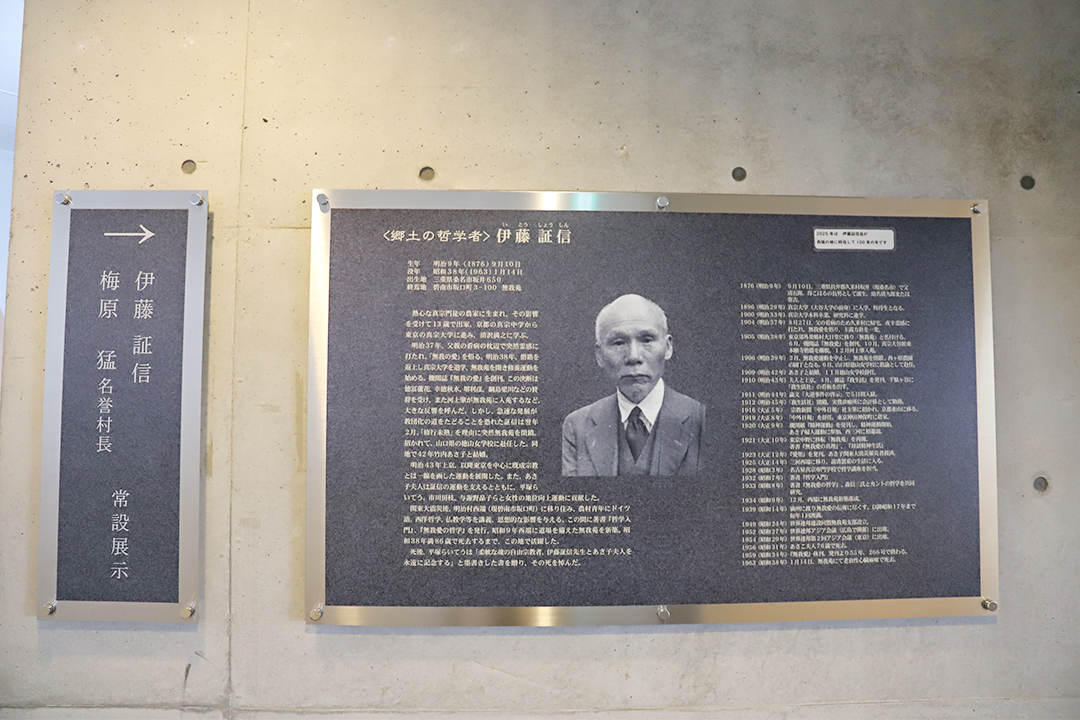奥には、伊藤証信翁の歴史を紹介するコーナーがあります。歴史をたどることで、この施設が持つ奥深さや思想の重みをより実感できます。