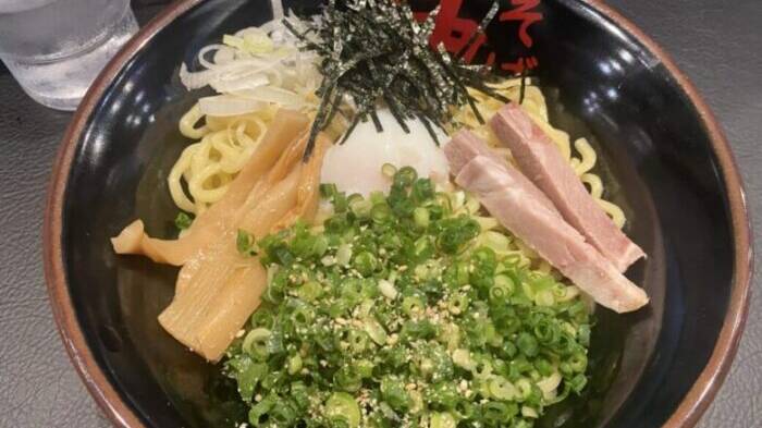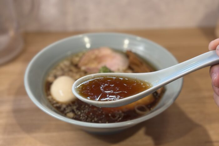スープはコクと旨味、醤油のキレが調和していて、大ぶりの背脂がアクセントになっています。