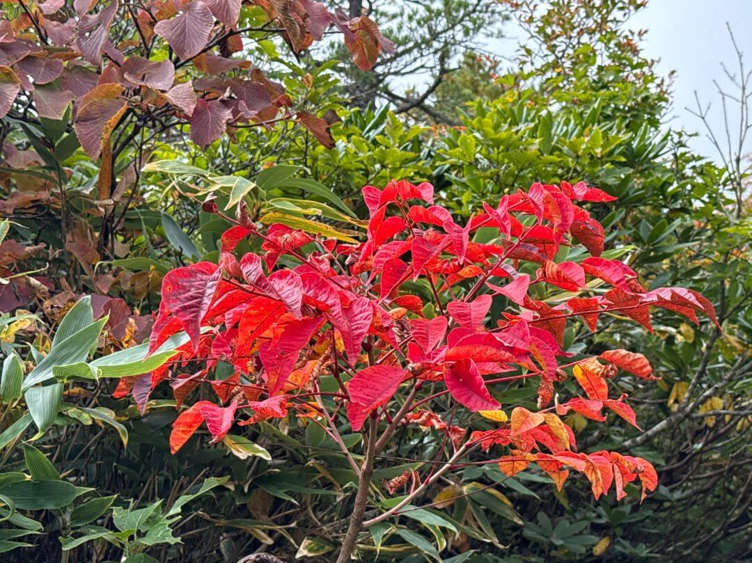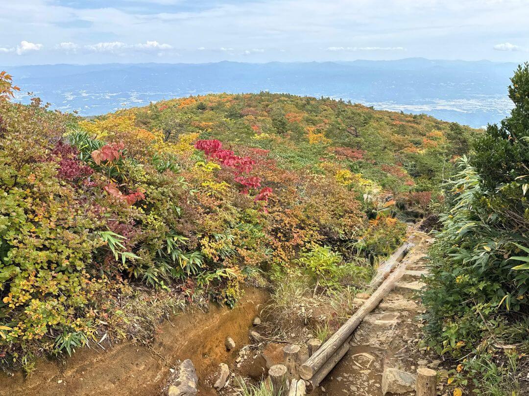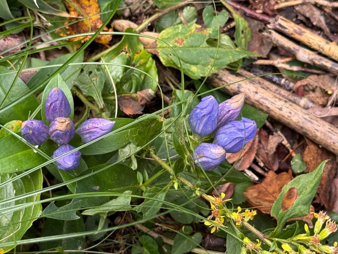 ここから本格的な登山に移る。ほどなく木道は終わり、山道に。沿道にはリンドウがあちこちでつぼみをのぞかせている。広島の山で見るリンドウに比べるとかなり大ぶりだ。猛暑の影響で紅葉にはまだ早いが、それでもところどころで美しい紅葉が見られた。