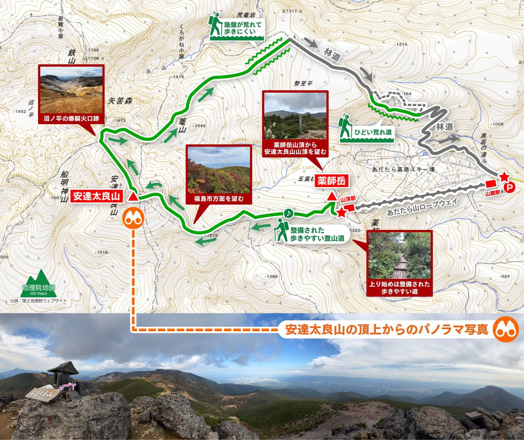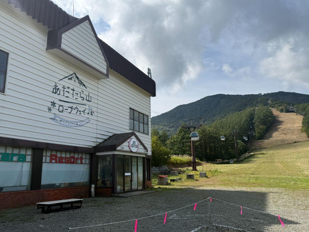 福島空港でレンタカーを借り、登山口のあるあだたら高原スキー場を目指す。駐車場到着は午前11時10分。支度を整え、あだたらロープウェイの山麓駅へ。既に標高は960メートル。ゴンドラに乗り込み、絶景を楽しみながら10分ほどで山頂駅に到着した。標高は1350メートルで、一気に400メートル近く上ったことになる。