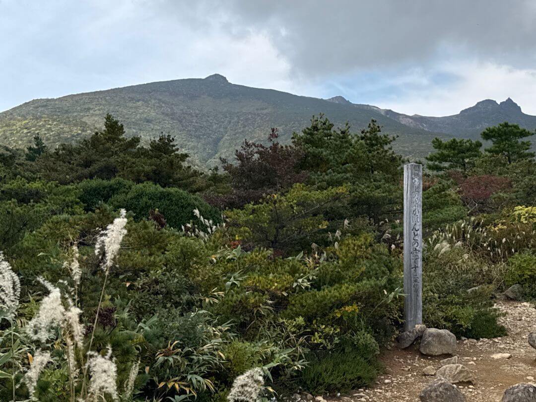 上り始めの登山道は木道になっており、歩きやすい。5分ほど歩いてまずは薬師岳(1322メートル)の山頂へ。立派な石造りのお社が立っている。周囲は遮るものがなく、すばらしい眺望だ。西に安達太良山の山頂が望める山頂広場には「この上の空がほんとの空です」と刻まれた記念碑が立っている。智恵子抄の描写に想を得たのだろう。残念ながら、上空は雲に覆われており、詩に描かれた「青い空」というわけにはいかなかった。