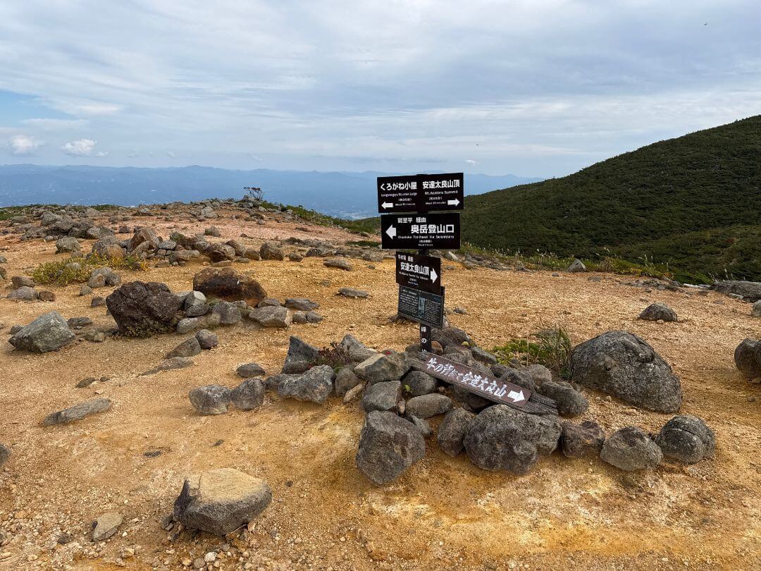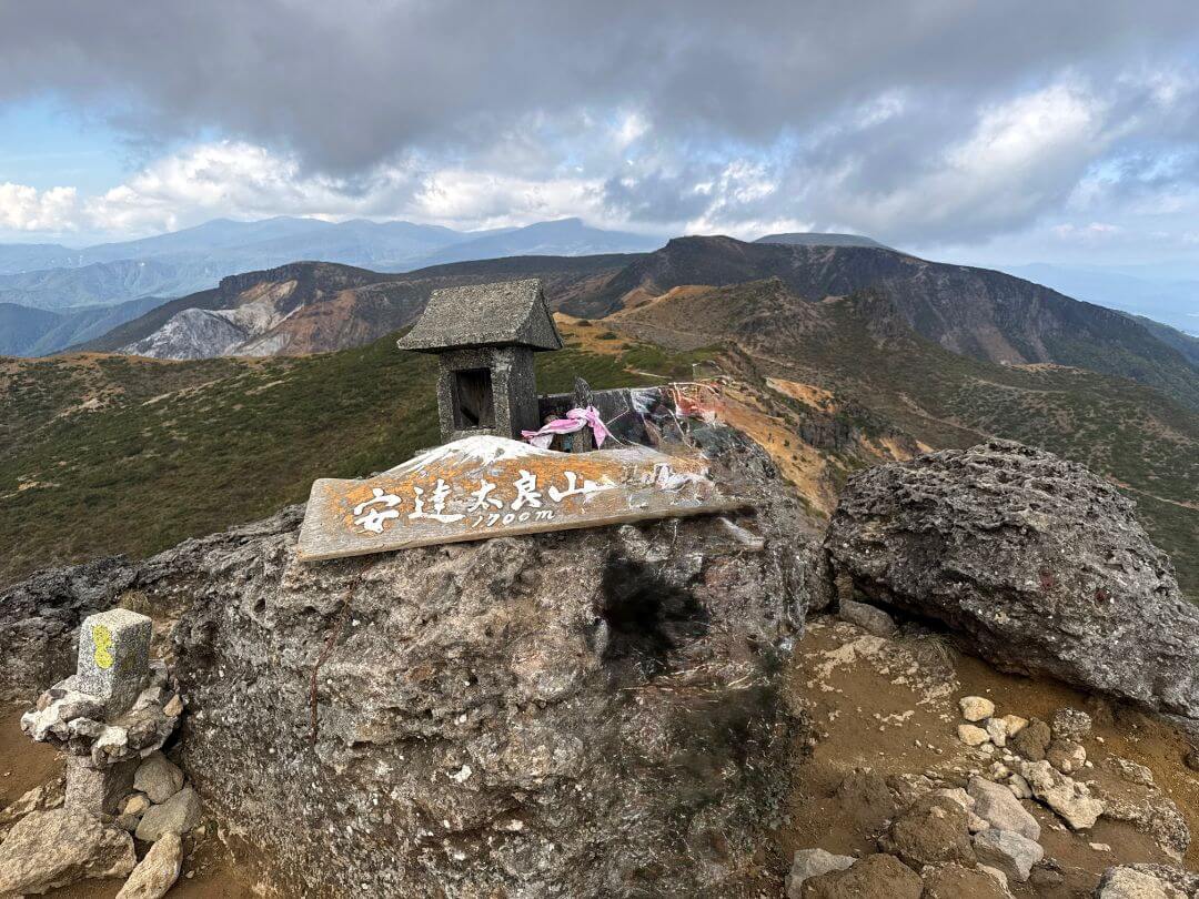 遮るもののない、すばらしい360度の展望だ。三角点横の岩の上には小さな祠と「安達太良山」の看板。百名山にふさわしい景色を満喫した。