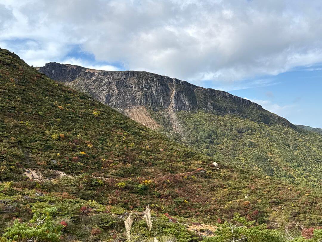 約30分で仙女平分岐に到着。標高は1477メートルで、少しずつ黄色や赤の葉が増えてくる。トンボが岩に止まっている光景も見られた。標高1500メートルを超えると樹木は低くなる。振り返ると紅葉もそこそこ進んでいる。