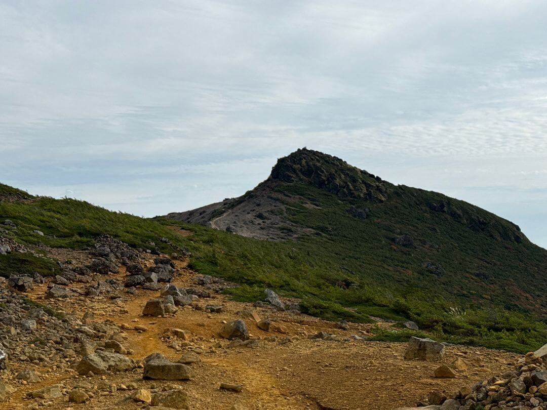 コンビニおにぎりの昼食を済ませ、今回の登山のもう一つのハイライト、沼ノ平の爆裂火口跡に向かう。牛ノ背と呼ばれる尾根を歩いて北に向かう。振り返ると、先ほど登頂した安達太良山の岩峰が立ち上がっている。頂上には登山者の姿も確認できた。