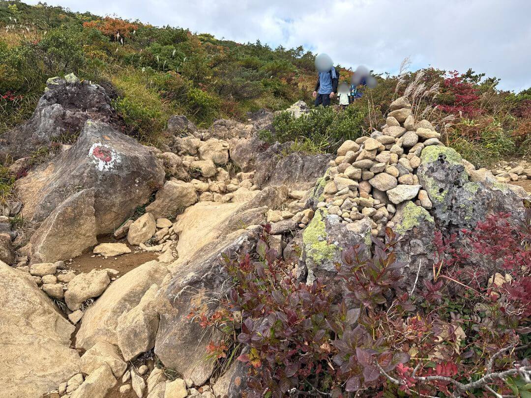 標高1600メートル付近になると、登山道の脇に石を積み上げたケルンが現れる。岩に赤白のペンキで目印が描かれているところも。比較的緩やかな地形だけに、悪天候で視界が悪くなると道を見失う恐れがあるためだ。